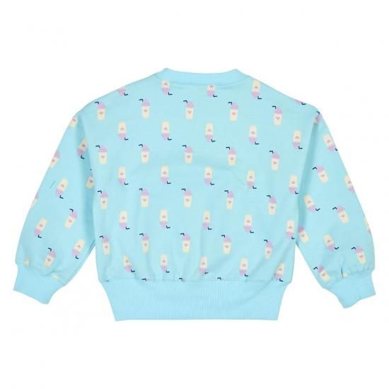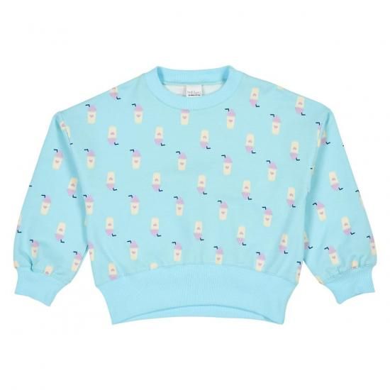 【裏起毛】スカイブルーの生地に、スラッシュアイスのドリンクプリントが散りばめられた長袖スウェット。動きやすさも考慮し、ストレッチのきいた生地を使用しています。華やかなカラーとプリントは、暗くなりがちな冬のコーディネイトをぱっと明るくしてくれます。