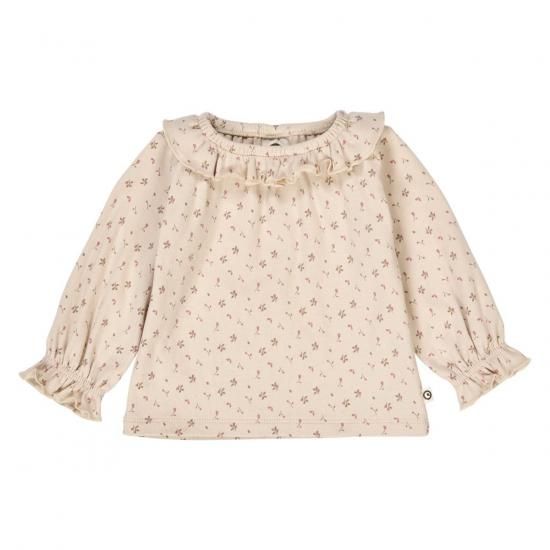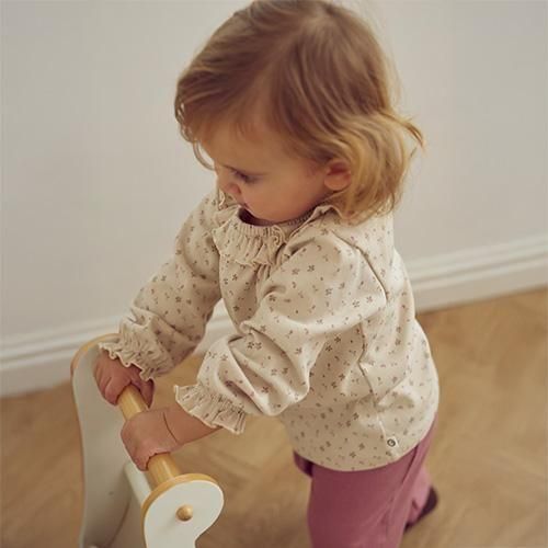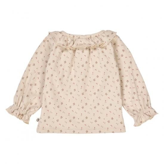 小さな花やつぼみがたくさんプリントされた長袖トップス。フリルのついた襟や袖もかわいらしく、ぱっと華やかに。やわらかく伸縮性のある生地は動きやすく、体の動きにしっかりフィット。パンツやスカートとのコーディネイトも楽しい1着です。