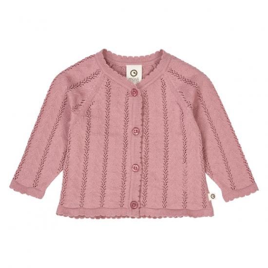 上品でかわいい透かし編みが入ったカーディガン。落ち着いたピンクカラーはキュートでやさしい印象に。襟や裾にはフリルがついていて、かわいらしさと甘さをプラス。オーガニックコットンならではの肌触りのよさもお楽しみいただけます。