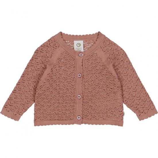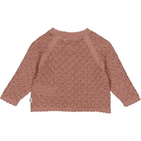小さな女の子向けのニットカーディガン。透かし編みがシンプルなカーディガンのかわいいアクセントになっています。オーガニックコットンを100%使用しているため、肌触りも抜群。前を開けて着たり、閉じて着たりとさまざまな着こなしが楽しめます。