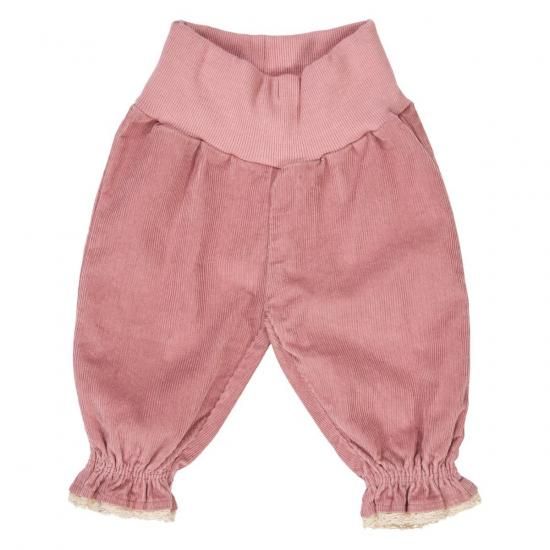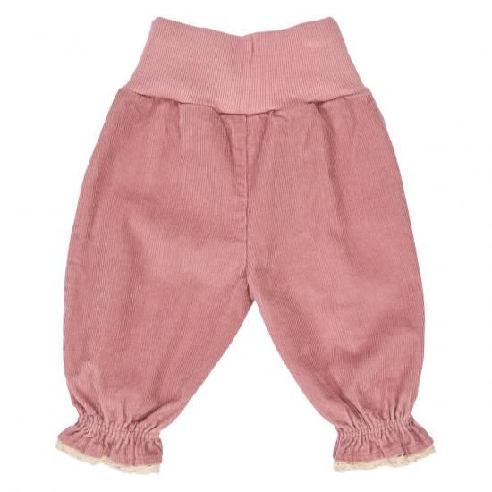 ゆったりとした作りが特徴の女の子向けコーデュロイパンツ。やわらかなピンクは、ラフすぎず女の子らしい雰囲気に。足元はギャザー仕上げでかわいいレースが。オーガニックコットン100%のやさしい肌触りも魅力です。