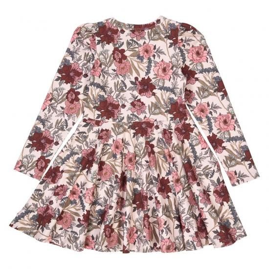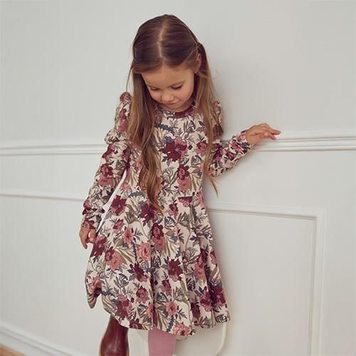 上品なボタニカル柄がかわいい長袖ワンピース。ウエストに入った切替がふわっと広がり、きれいなシルエットを描きます。レギンスやタイツとのコーディネイトもぜひお楽しみください。スカート丈はひざ〜ひざ下ほどとなります。