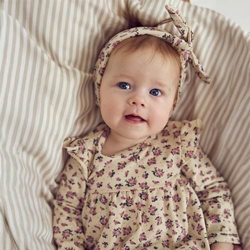 上品にデザインされた花が散りばめられたキュートなヘッドバンド。フロントの結び目はほどけるようになっていて、サイズにあわせて調整できます。伸縮性のある生地で作られているため、締め付けずにフィットするのもうれしいポイント。ベビーからキッズまで着用可能です。