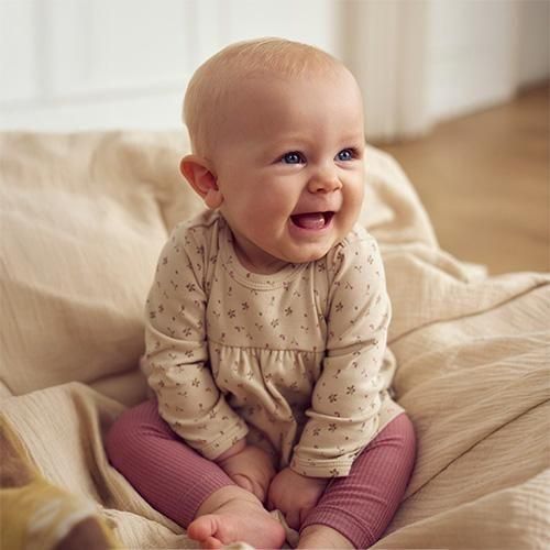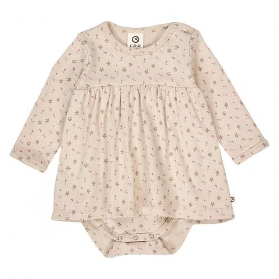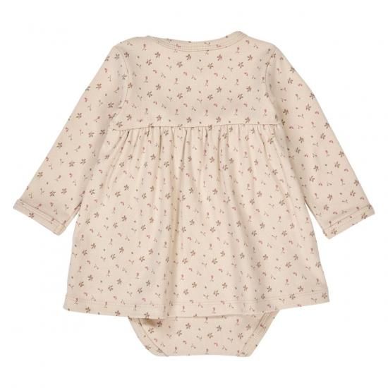 小さな花やつぼみがたくさんプリントされた、キュートなボディドレス。胸下から切り替えが入っていて、ふんわりとかわいらしく広がります。生地には伸縮性があり、動きやすいのも特長。肩部分にはスナップボタンがついていて、お着替えをより簡単に。