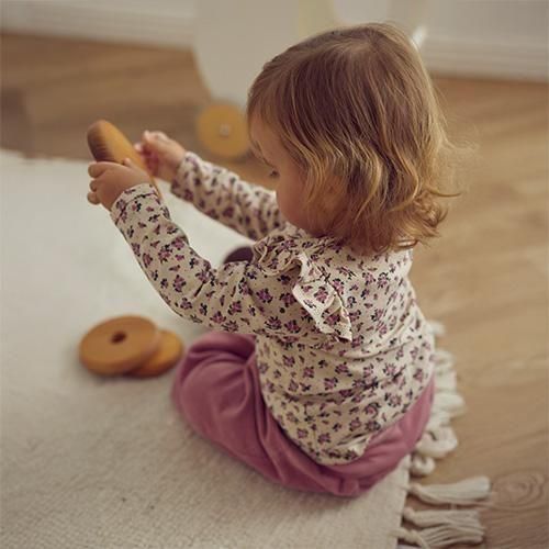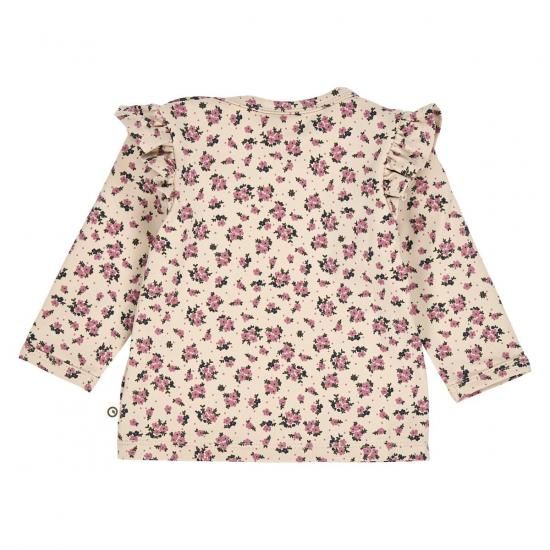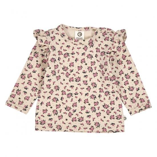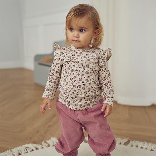 小さな花々が全面に散りばめられたキュートな長袖Tシャツ。肩部分のフリルもかわいらしく、女の子らしさをよりアップ。伸縮性のあるやわらかな生地は着心地がよく、体の動きによくフィットしてくれます。パンツやスカートとのコーディネイトも楽しい1着です。