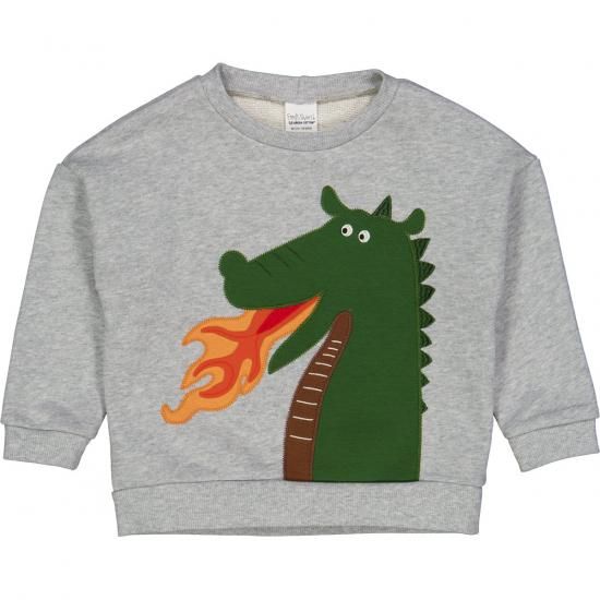 火を吹くドラゴンがアップリケされたかわいいスウェット。どこかユーモラスな表情にも遊び心が。アップリケにはフリースとカラフルな生地を使用しています。やわらかな生地はオーガニックコットンを100%使用。心地いい肌触りもお楽しみください。