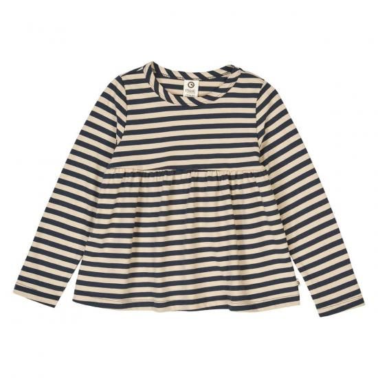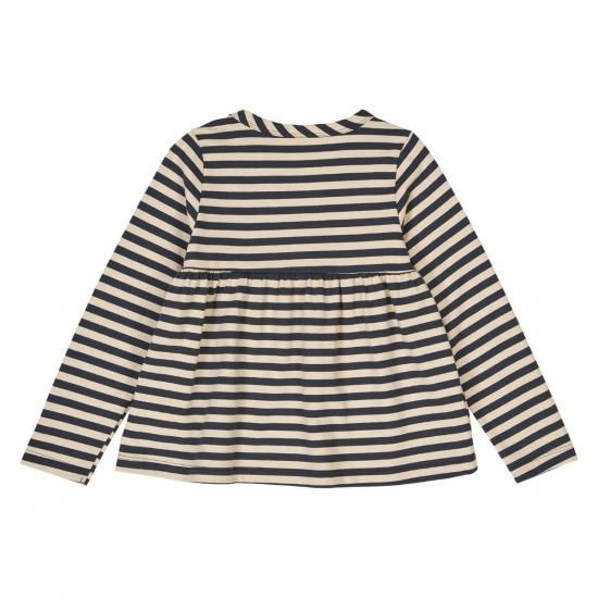 ベーシックなボーダーで大人っぽく仕上げた女の子向けトップス。。胸下から切り替えが入り、ふんわり裾が広がります。ネイビー×クリームカラーは甘くなりすぎず、すっきりまとめたい時にもおすすめ。オーガニックコットン100%ならではの、肌触りのよさもお楽しみいただけます。