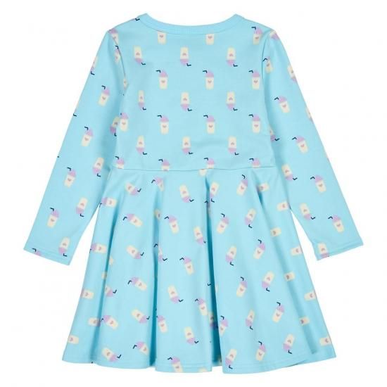 【裏起毛】スカイブルーの生地に、スラッシュアイスのドリンクプリントが散りばめられたワンピース。ウエスト部分に切り替えがあり、スカート部分はたっぷりと生地を使用しています。スカートはふわっと美しいシルエットを描き、女の子らしさも◎。動きやすさも考慮し、ストレッチのきいた生地を使用しています。