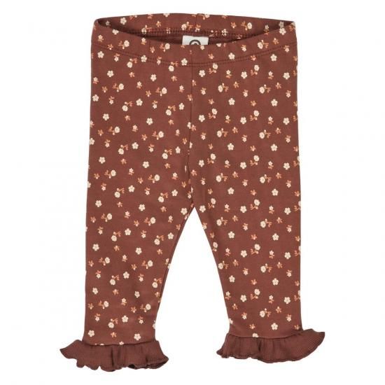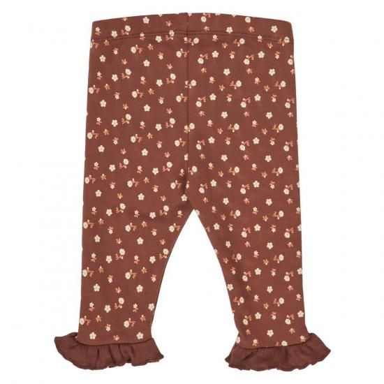 【裏起毛】足元のすそ部分にフリルがついた女の子向けパンツ。小さな花がたくさんプリントされています。やわらかく伸縮性がある生地は、動きやすく元気な赤ちゃんにぴったり。ブラウンの生地は甘くなりすぎず、秋冬のおしゃれを上品に盛り上げてくれます。